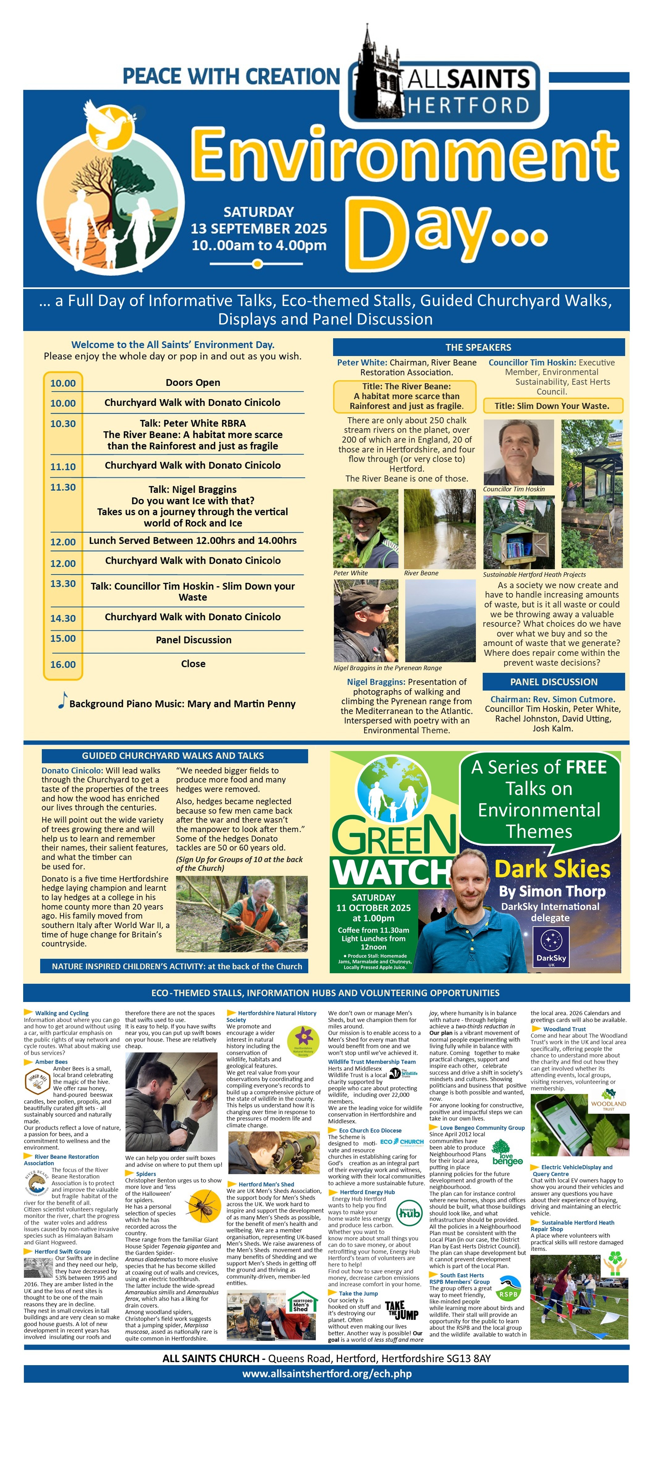 Saturday, September 13th at All Saints Church in Hertford is a day dedicated to Environment, Climate and Hope.The programme runs from 10:00 to 16:00 and visitors can stay for the day or drop in from time to time as best suits them.